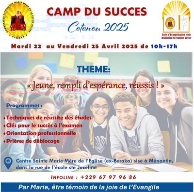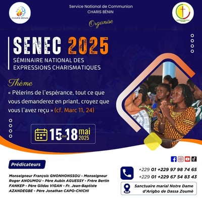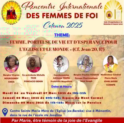 Archidiocèse de Cotonou : Samedi 18h30 Paroisse Marie Auxiliatrice de Ménontin - Mercredi 12h Centre Sainte Marie Mère de l'Eglise à Ménontin